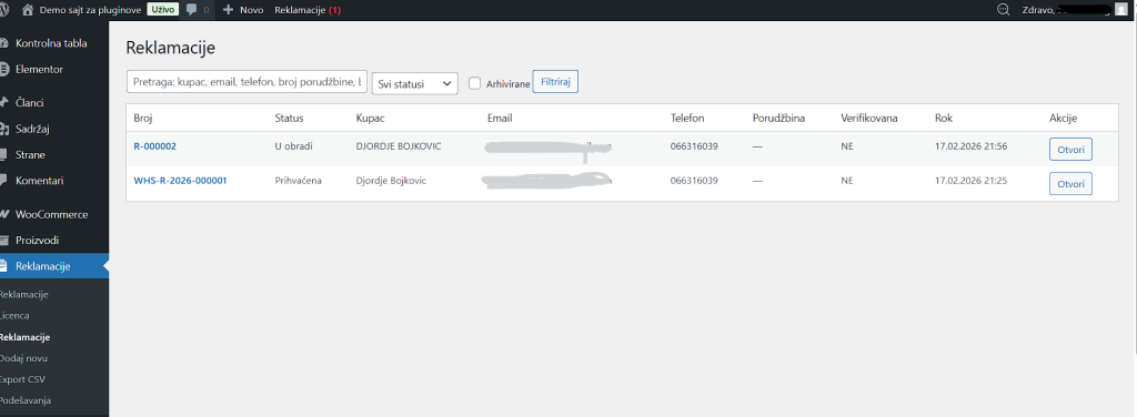 Ovaj WordPress dodatak je napravljen da ti reklamacije više ne budu “papiri po fiokama”, poruke po Viberu i traženje mejlova unazad. Sve reklamacije se beleže na jednom mestu, sa jasnim statusima, rokovima i kompletnom istorijom komunikacije – spremno za stvaran rad i zakonske obaveze.