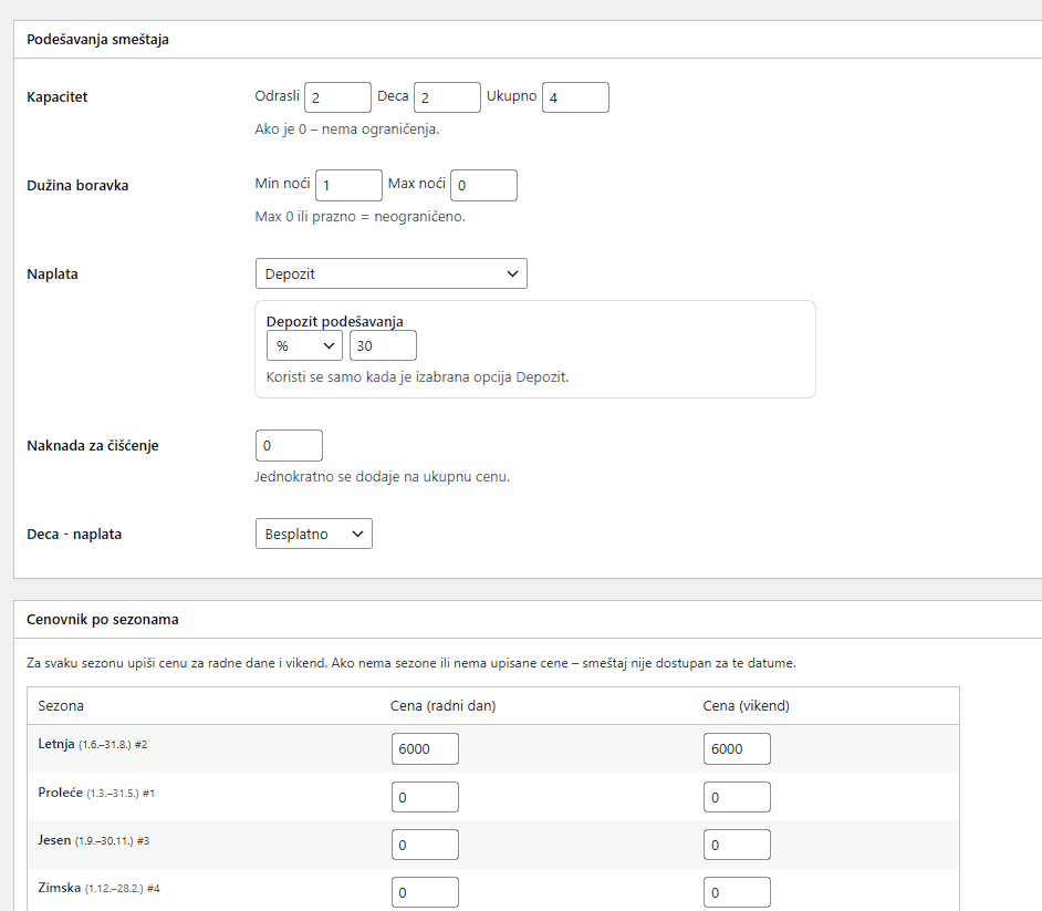 Plugin koristi ponavljajuće sezone (Proleće/Leto/Jesen/Zima) koje važe svake godine, a za svaku sezonu se definišu cene za radne dane i vikend, pa obračun automatski meša cene kada rezervacija obuhvata oba tipa dana (npr. čet–uto). Datumi koji nisu dostupni (nema sezone ili nema cenovnika) su odmah sivi i ne mogu da se izaberu, isto kao i datumi koji su već rezervisani ili blokirani – kalendar uvek prikazuje realnu dostupnost. Sinhronizacija sa Airbnb/Booking radi preko iCal linkova (import/export), tako da ne zavisi od API pristupa i radi na svim nalozima.