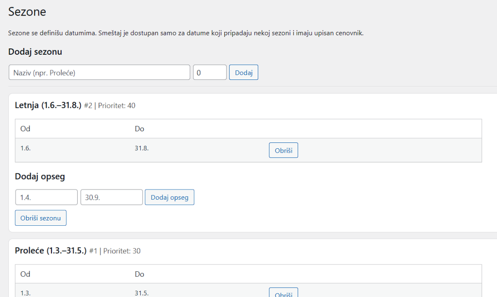 Sezone bez godina (ponavljajuće svake godine) + cene za radne dane i vikend