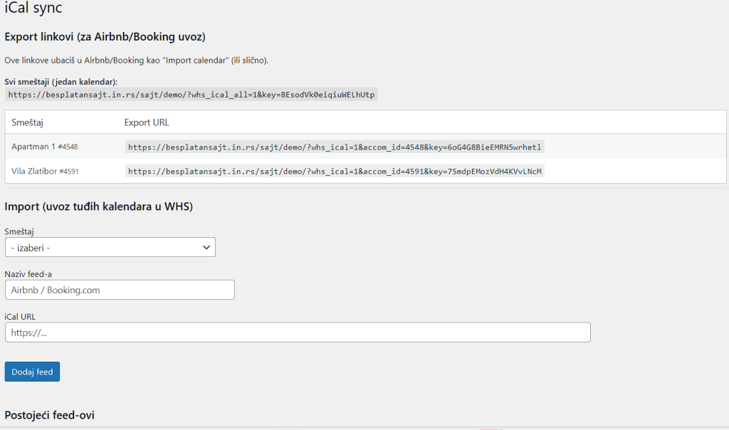 iCal sync (Airbnb/Booking): export + import, blokade iz eksternih kalendara